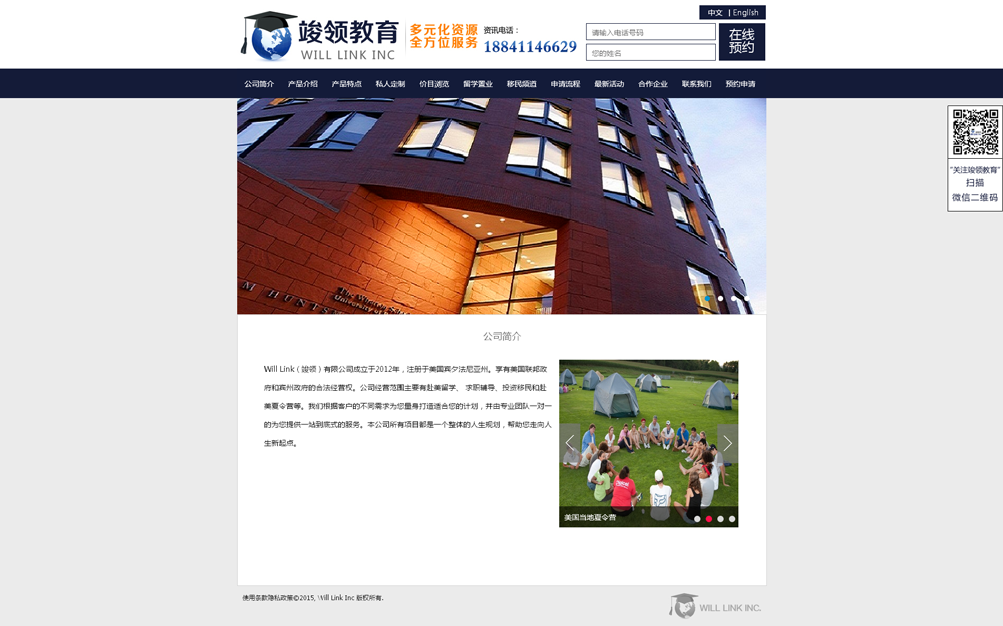 Will Link ( 竣領)有限公司成立于2012年,注冊于美國賓夕法尼亞州。享有美國聯邦政府和賓州政府的合法經營權。公司經營范圍主要有赴美留學、 求職輔導、投資移民和赴美夏令營等。我們根據客戶的不同需求為您量身打造適合您的計劃,并由專業團隊一對一的為您提供一站到底式的服務。本公司所有項目都是一個整體的人生規劃,幫助您走向人生新起點。